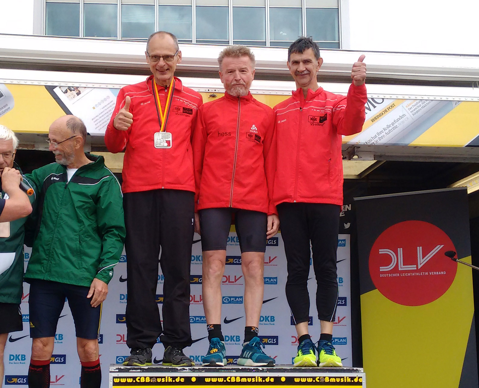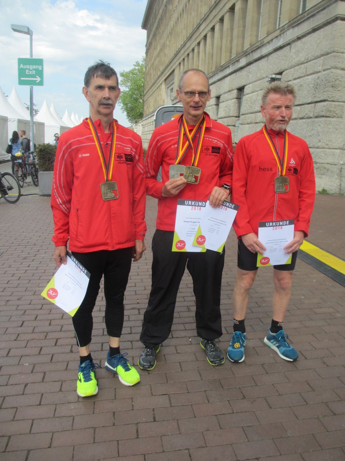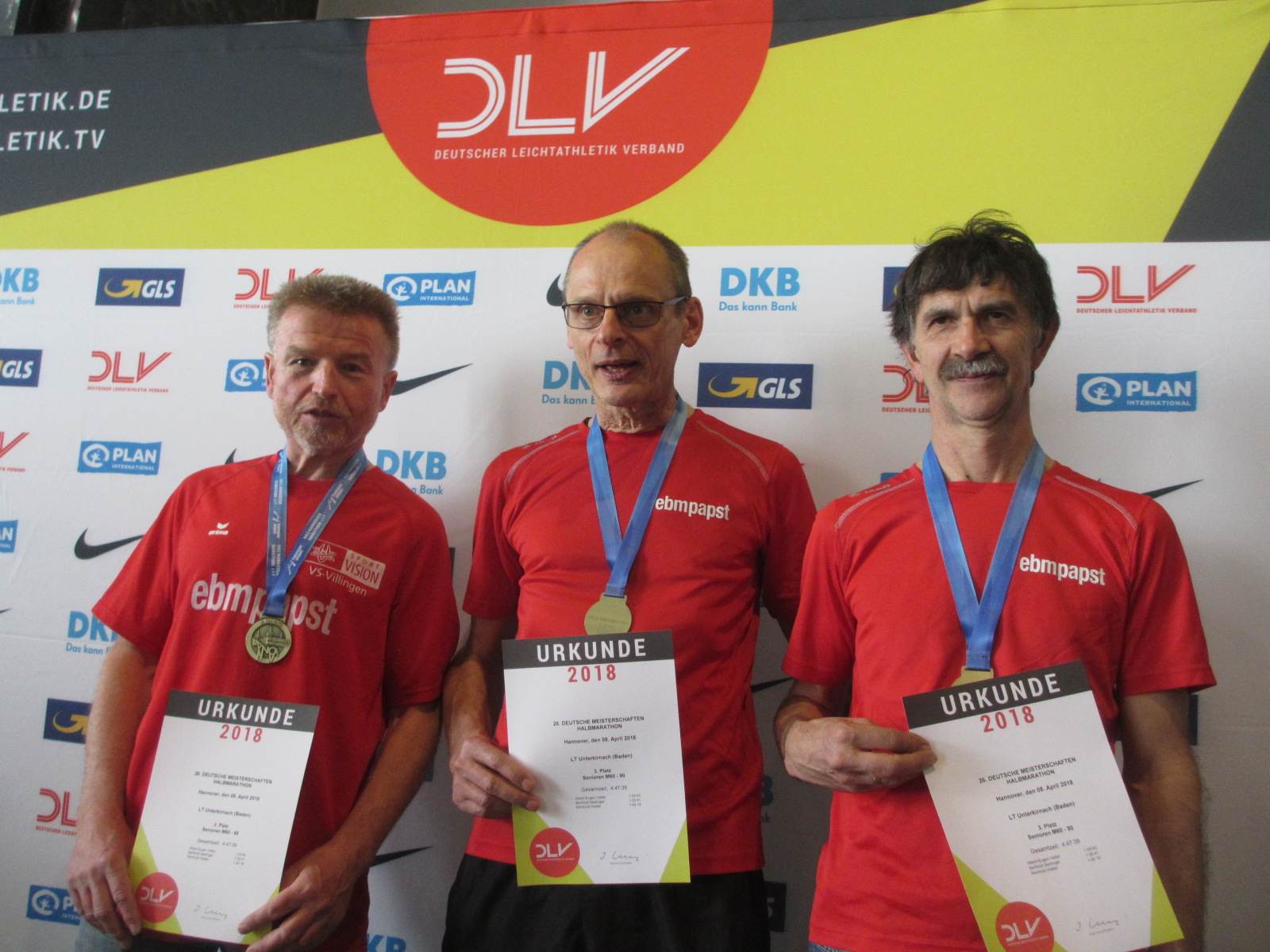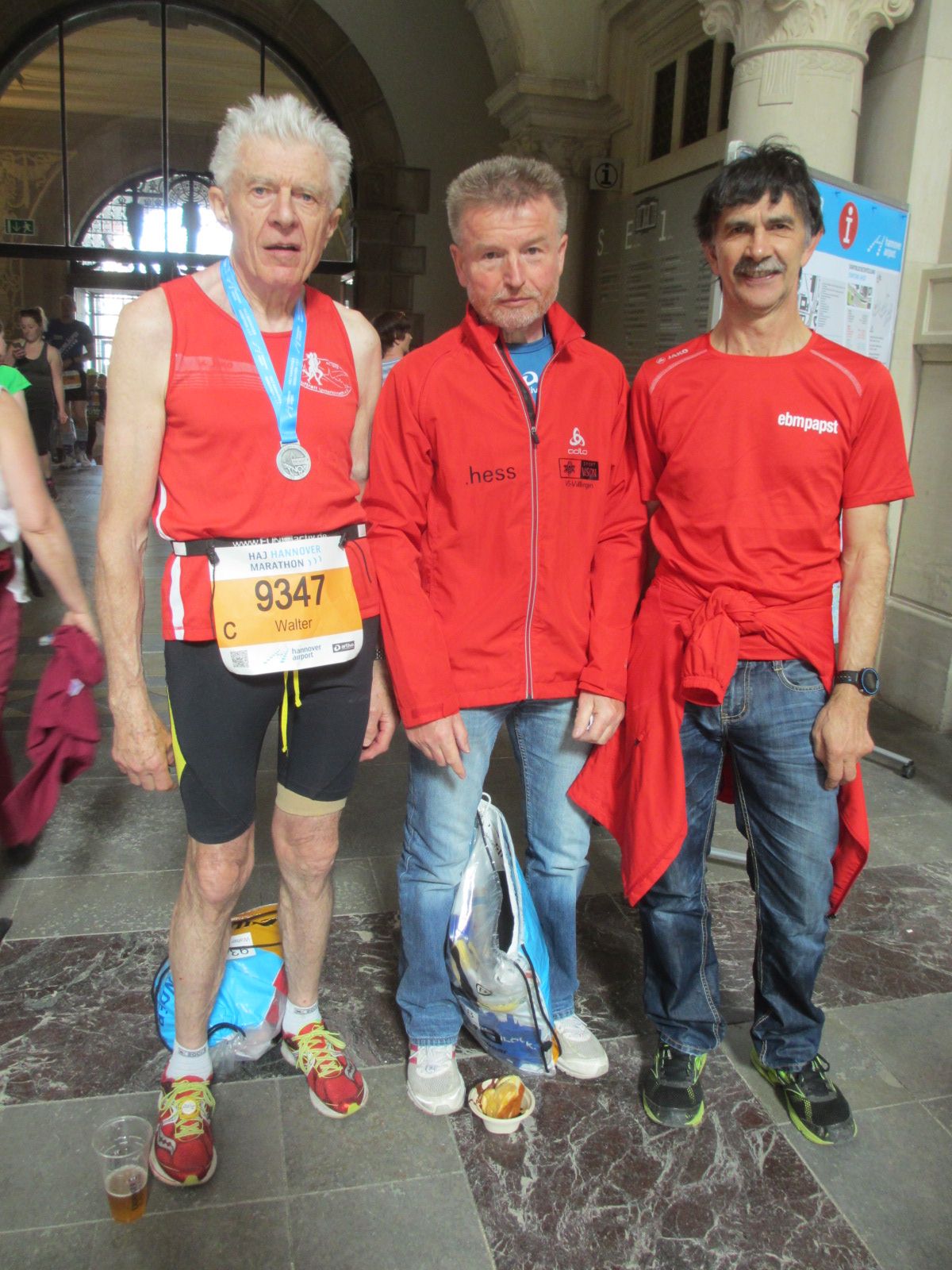 Im Rahmen des 28. HAJ Hannover Marathons wurden die 26. Deutschen Meisterschaften im Halbmarathon ausgetragen. Nach der aktuellen Ergebnisliste überquerten 6036 Teilnehmer die Ziellinie. 5646 Männer und 390 Frauen. Davon wurden 489 männliche und 230 weibliche Finisher für die DM gewertet. Darunter waren auch 4 Sportler vom LT Unterkirnach. Bei blauem Himmel, Sonnenschein und 20 Grad fiel um 10:45 Uhr der Startschuss. Albert-Eugen Vetter hatte sich genau nach Plan seiner Trainerin vorbereitet und ging richtig schwungvoll ins Rennen. Er musste dann allerdings das Tempo rausnehmen, da er mit der steigenden Temperatur nicht zurecht kam. Dennoch lief er in die TOP TEN mit 1:29:40 h und wurde 6. in der Altersklasse M60 und 249. im Gesamteinlauf der Männer - DM. Berthold Seelinger lief trotz der warmen Temperatur flott an, wollte seine Vorjahreszeit wiederholen und war mit 43Min. 31Sek. bei km10 noch voll auf Kurs. Auf der 2ten Hälfte konnte er das Tempo nicht mehr durchziehen, verlor von Kilometer zu Kilometer an Zeit und kämpfte sich mit 1:35:41 ins Ziel. Er wurde 14. in der Altersklasse M60 und 309. im Gesamteinlauf der Männer - DM. Reinhold Walter lief nach der gesundheitsbedingten Absage von Lutz Kuhardt als 3. Mann für das M60 Team. Er startete ohne Risiko, orientierte sich an der 1:40:00h Marke, versuchte gleichmäßig zu laufen um so sein Ziel zu erreichen. Doch auch ihm machte das Wetter einen Strich durch die Rechnung. Im Ziel wurde er mit 1:42:18h gestoppt und wurde 21. in der Altersklasse M60 und 369. im Gesamteinlauf der Männer - DM. Das M60 Team diskutierte bereits im Zielbereich über die verlorenen Minuten und hakte das Siegerpodest schon ab. Bei den Gesprächen mit den anderen Teilnehmern hörte man aber deutlich heraus, dass alle an Zeit verloren hatten und die Hoffnung auf eine Medaille stieg wieder.