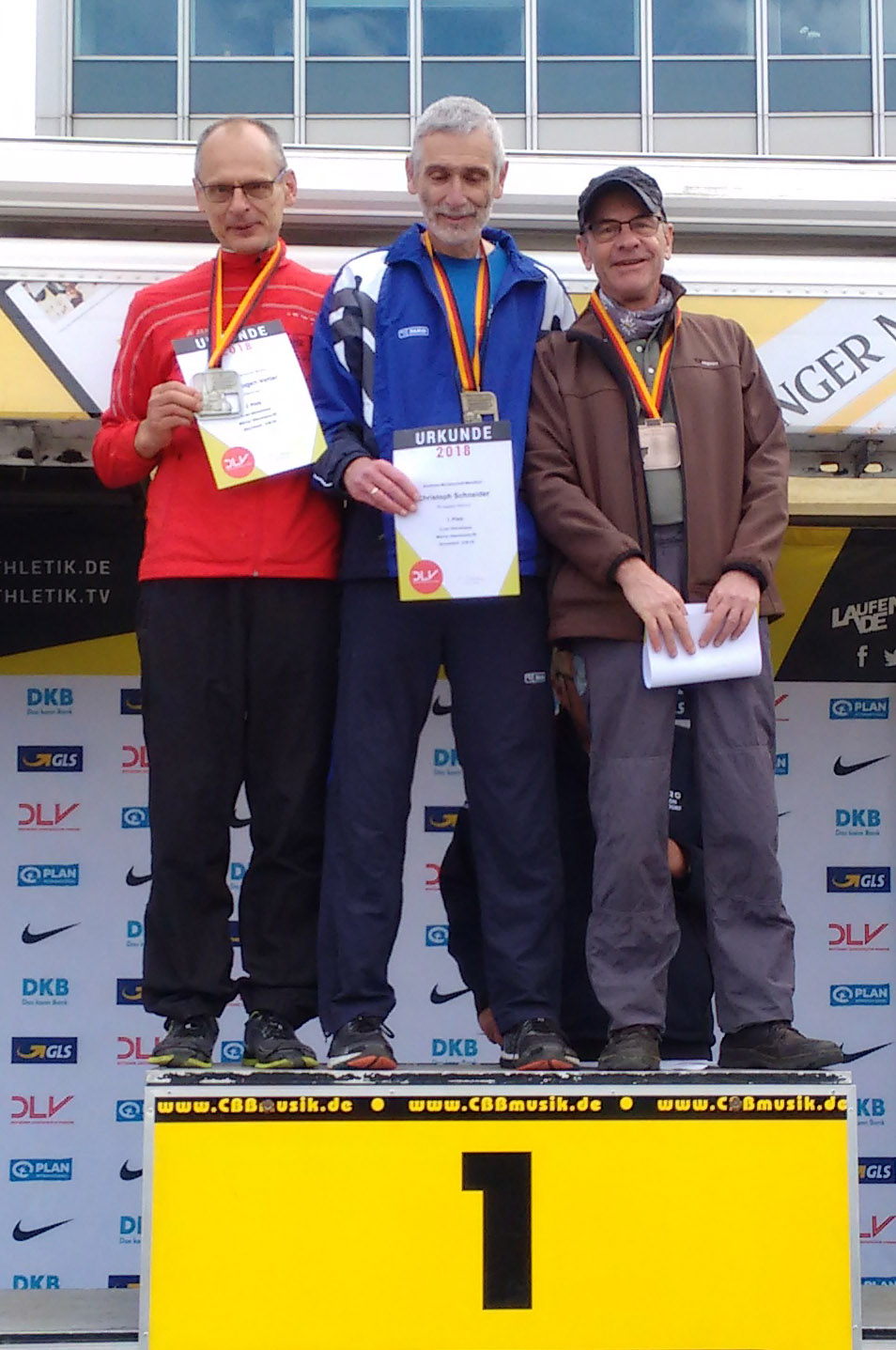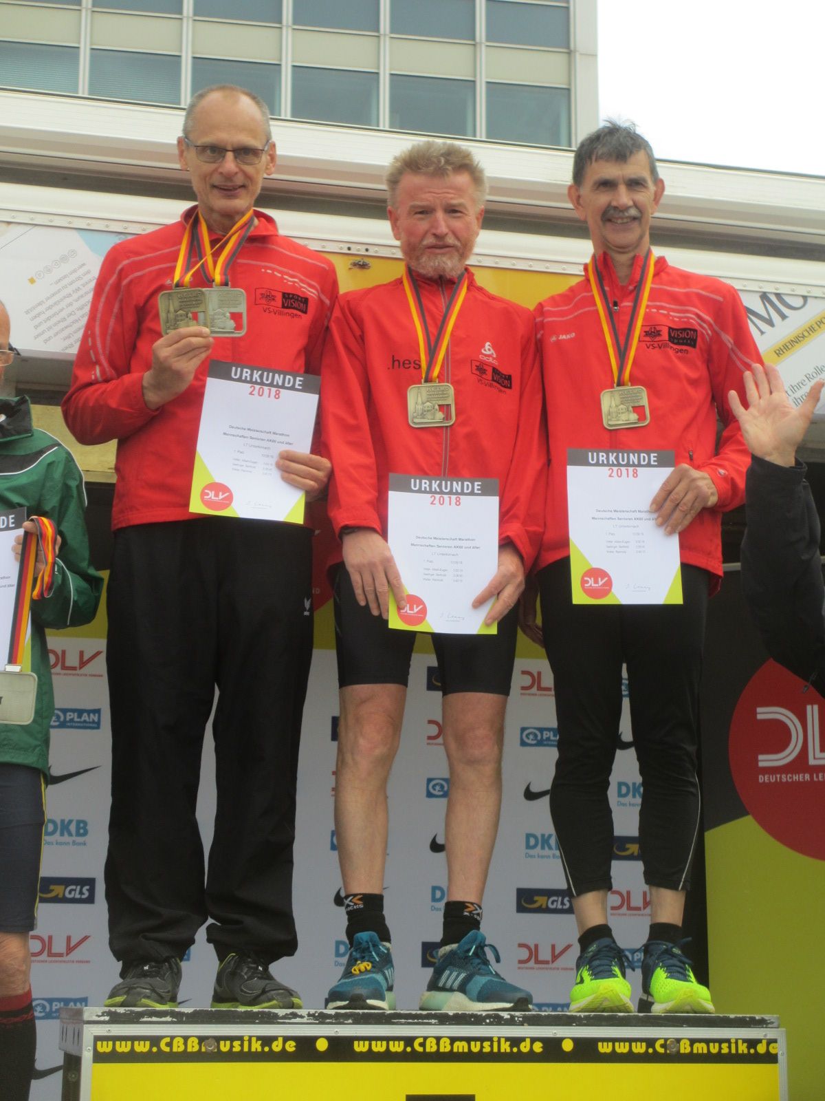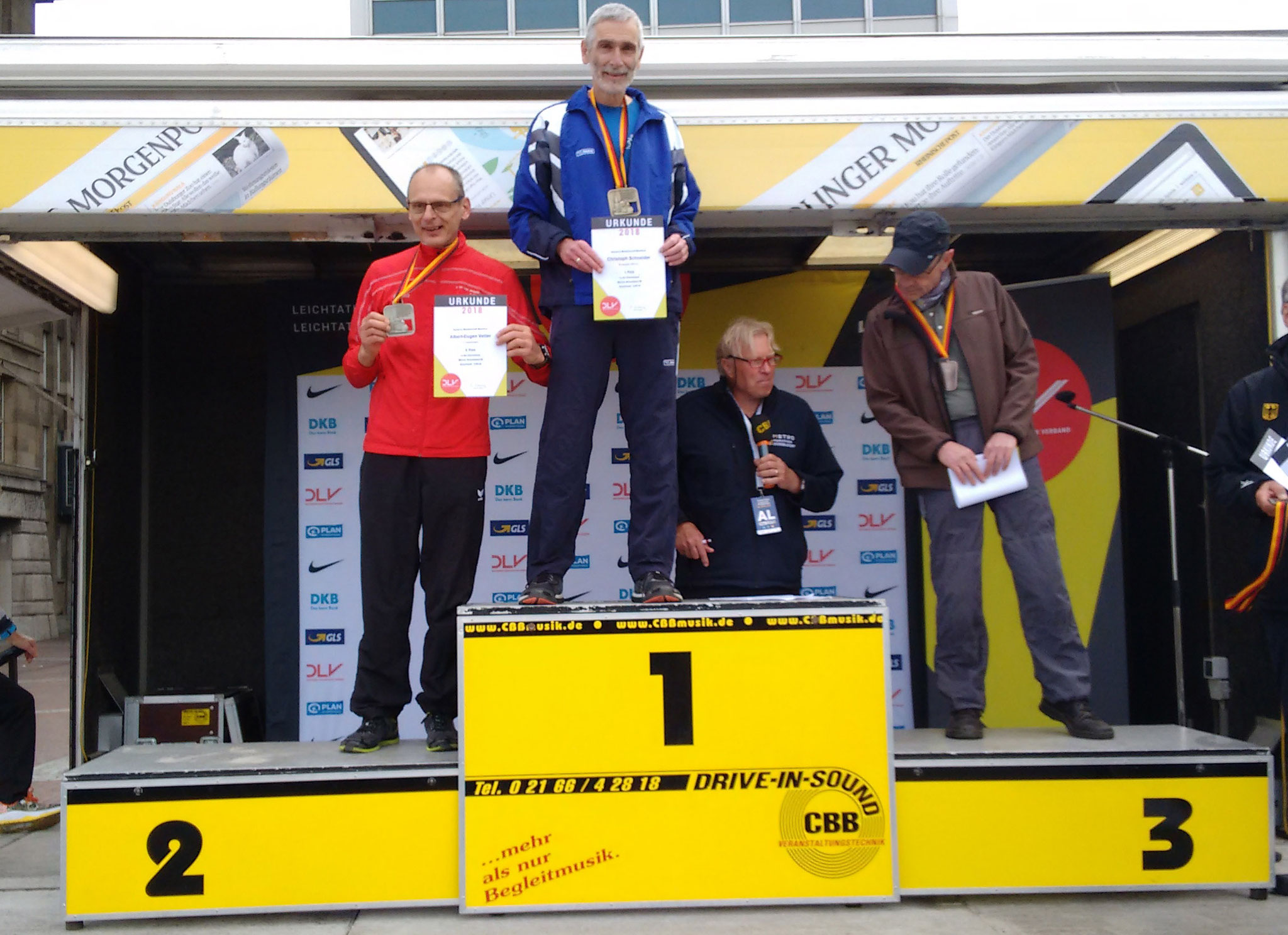 Im Rahmen des 28. HAJ Hannover Marathons wurden die 26. Deutschen Meisterschaften im Halbmarathon ausgetragen. Nach der aktuellen Ergebnisliste überquerten 6036 Teilnehmer die Ziellinie. 5646 Männer und 390 Frauen. Davon wurden 489 männliche und 230 weibliche Finisher für die DM gewertet. Darunter waren auch 4 Sportler vom LT Unterkirnach. Bei blauem Himmel, Sonnenschein und 20 Grad fiel um 10:45 Uhr der Startschuss. Albert-Eugen Vetter hatte sich genau nach Plan seiner Trainerin vorbereitet und ging richtig schwungvoll ins Rennen. Er musste dann allerdings das Tempo rausnehmen, da er mit der steigenden Temperatur nicht zurecht kam. Dennoch lief er in die TOP TEN mit 1:29:40 h und wurde 6. in der Altersklasse M60 und 249. im Gesamteinlauf der Männer - DM. Berthold Seelinger lief trotz der warmen Temperatur flott an, wollte seine Vorjahreszeit wiederholen und war mit 43Min. 31Sek. bei km10 noch voll auf Kurs. Auf der 2ten Hälfte konnte er das Tempo nicht mehr durchziehen, verlor von Kilometer zu Kilometer an Zeit und kämpfte sich mit 1:35:41 ins Ziel. Er wurde 14. in der Altersklasse M60 und 309. im Gesamteinlauf der Männer - DM. Reinhold Walter lief nach der gesundheitsbedingten Absage von Lutz Kuhardt als 3. Mann für das M60 Team. Er startete ohne Risiko, orientierte sich an der 1:40:00h Marke, versuchte gleichmäßig zu laufen um so sein Ziel zu erreichen. Doch auch ihm machte das Wetter einen Strich durch die Rechnung. Im Ziel wurde er mit 1:42:18h gestoppt und wurde 21. in der Altersklasse M60 und 369. im Gesamteinlauf der Männer - DM. Das M60 Team diskutierte bereits im Zielbereich über die verlorenen Minuten und hakte das Siegerpodest schon ab. Bei den Gesprächen mit den anderen Teilnehmern hörte man aber deutlich heraus, dass alle an Zeit verloren hatten und die Hoffnung auf eine Medaille stieg wieder.
