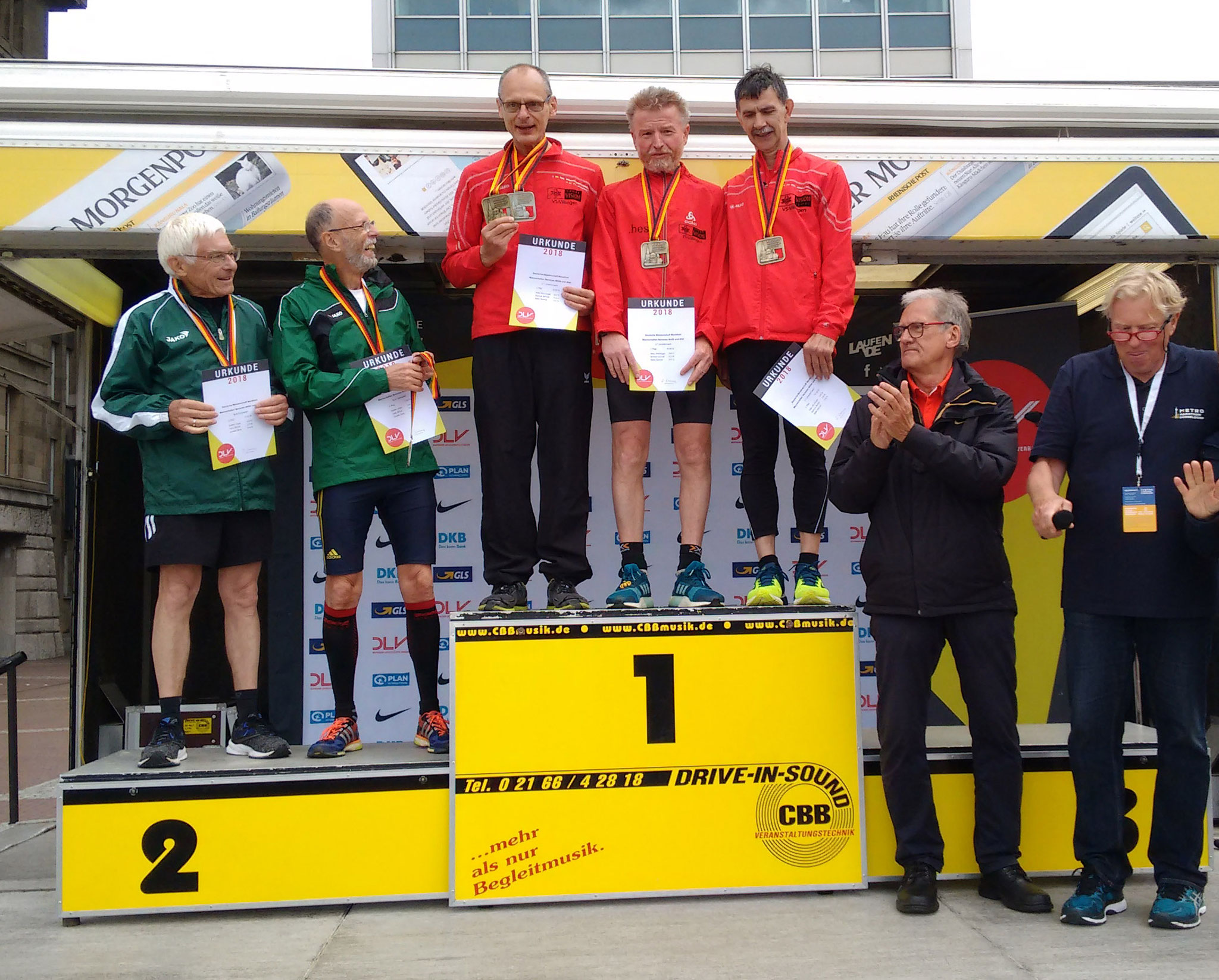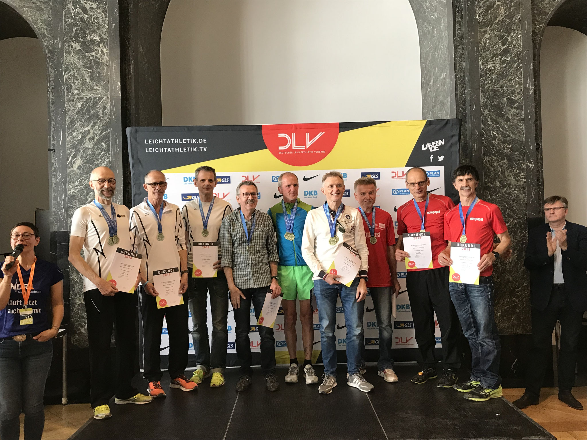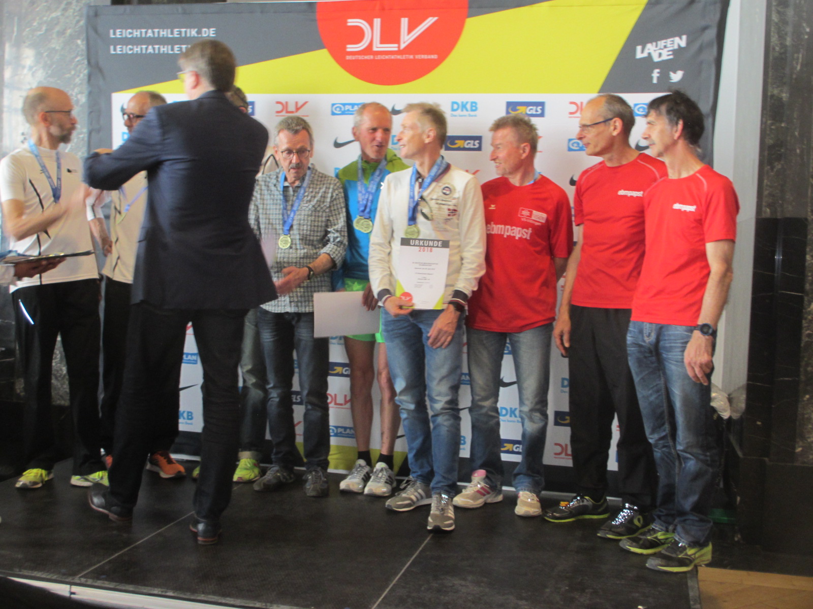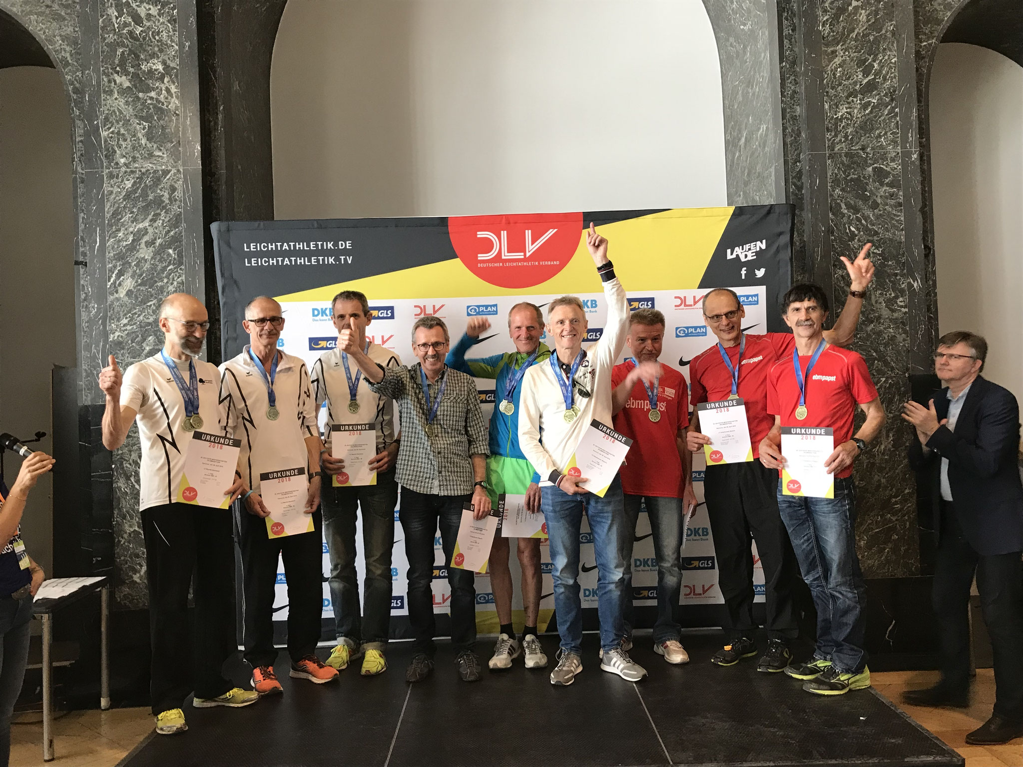 Im Rahmen des 28. HAJ Hannover Marathons wurden die 26. Deutschen Meisterschaften im Halbmarathon ausgetragen. Nach der aktuellen Ergebnisliste überquerten 6036 Teilnehmer die Ziellinie. 5646 Männer und 390 Frauen. Davon wurden 489 männliche und 230 weibliche Finisher für die DM gewertet. Darunter waren auch 4 Sportler vom LT Unterkirnach. Bei blauem Himmel, Sonnenschein und 20 Grad fiel um 10:45 Uhr der Startschuss. Albert-Eugen Vetter hatte sich genau nach Plan seiner Trainerin vorbereitet und ging richtig schwungvoll ins Rennen. Er musste dann allerdings das Tempo rausnehmen, da er mit der steigenden Temperatur nicht zurecht kam. Dennoch lief er in die TOP TEN mit 1:29:40 h und wurde 6. in der Altersklasse M60 und 249. im Gesamteinlauf der Männer - DM. Berthold Seelinger lief trotz der warmen Temperatur flott an, wollte seine Vorjahreszeit wiederholen und war mit 43Min. 31Sek. bei km10 noch voll auf Kurs. Auf der 2ten Hälfte konnte er das Tempo nicht mehr durchziehen, verlor von Kilometer zu Kilometer an Zeit und kämpfte sich mit 1:35:41 ins Ziel. Er wurde 14. in der Altersklasse M60 und 309. im Gesamteinlauf der Männer - DM. Reinhold Walter lief nach der gesundheitsbedingten Absage von Lutz Kuhardt als 3. Mann für das M60 Team. Er startete ohne Risiko, orientierte sich an der 1:40:00h Marke, versuchte gleichmäßig zu laufen um so sein Ziel zu erreichen. Doch auch ihm machte das Wetter einen Strich durch die Rechnung. Im Ziel wurde er mit 1:42:18h gestoppt und wurde 21. in der Altersklasse M60 und 369. im Gesamteinlauf der Männer - DM. Das M60 Team diskutierte bereits im Zielbereich über die verlorenen Minuten und hakte das Siegerpodest schon ab. Bei den Gesprächen mit den anderen Teilnehmern hörte man aber deutlich heraus, dass alle an Zeit verloren hatten und die Hoffnung auf eine Medaille stieg wieder.