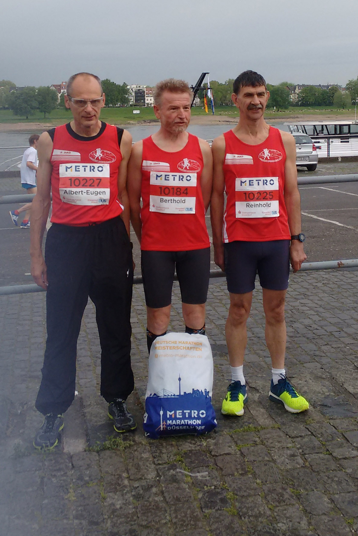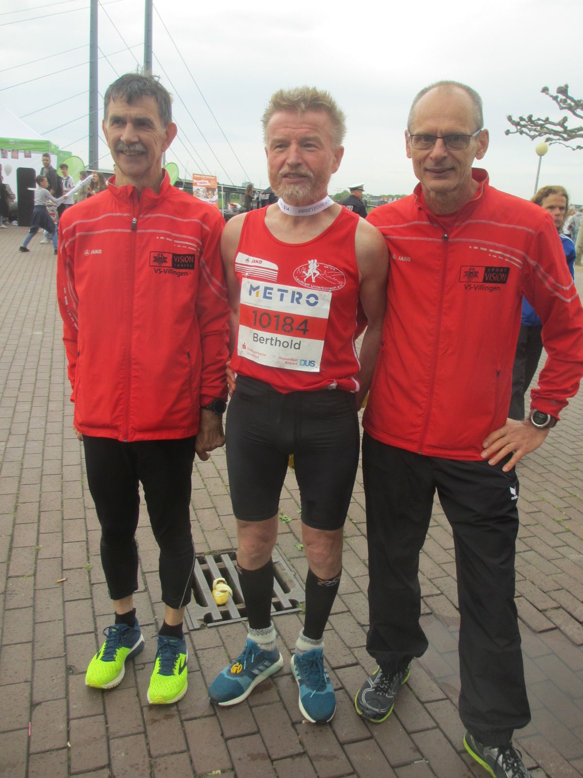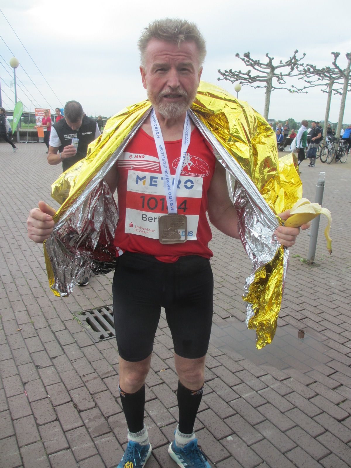 Im Rahmen des 16. METRO Marathons Düsseldorf wurden die Deutschen Meisterschaften im Marathon ausgetragen. Nach der aktuellen Ergebnisliste überquerten 2732 Teilnehmer die Ziellinie. 2167 Männer und 565 Frauen. Davon wurden 252 männliche und 83 weibliche Finisher für die DM gewertet. Darunter waren auch 3 Sportler vom LT Unterkirnach. Bei grauem Himmel und etwas Regen, fiel um 9:00 Uhr der Startschuss. Albert-Eugen Vetter hatte sich wieder nach Plan seiner Trainerin vorbereitet und wurde zusätzlich von der Sportpresse zu den Favoriten der Altersklasse M60 gezählt. Hoch motiviert und auf die Sekunde TOP FIT ging er ins Rennen. Vom Start weg volles Tempo, nur die Phase bei strömenden Regen brachte ihn etwas aus dem Rhythmus, lief er in 3:00:22 h ins Ziel und wurde 2. in der Altersklasse M60 und 119. im Gesamteinlauf der Männer-DM. Etwas weniger Regen und Albert-Eugen hätte nicht nur die SILBEREMEDAILLE erobert sondern auch noch die magische 3h Grenze geknackt! Wir sagen. “HERZLICHEN GLÜCKWUNSCH“ und vielleicht klappt es bei der nächsten DM mit der 3h-Grenze!
