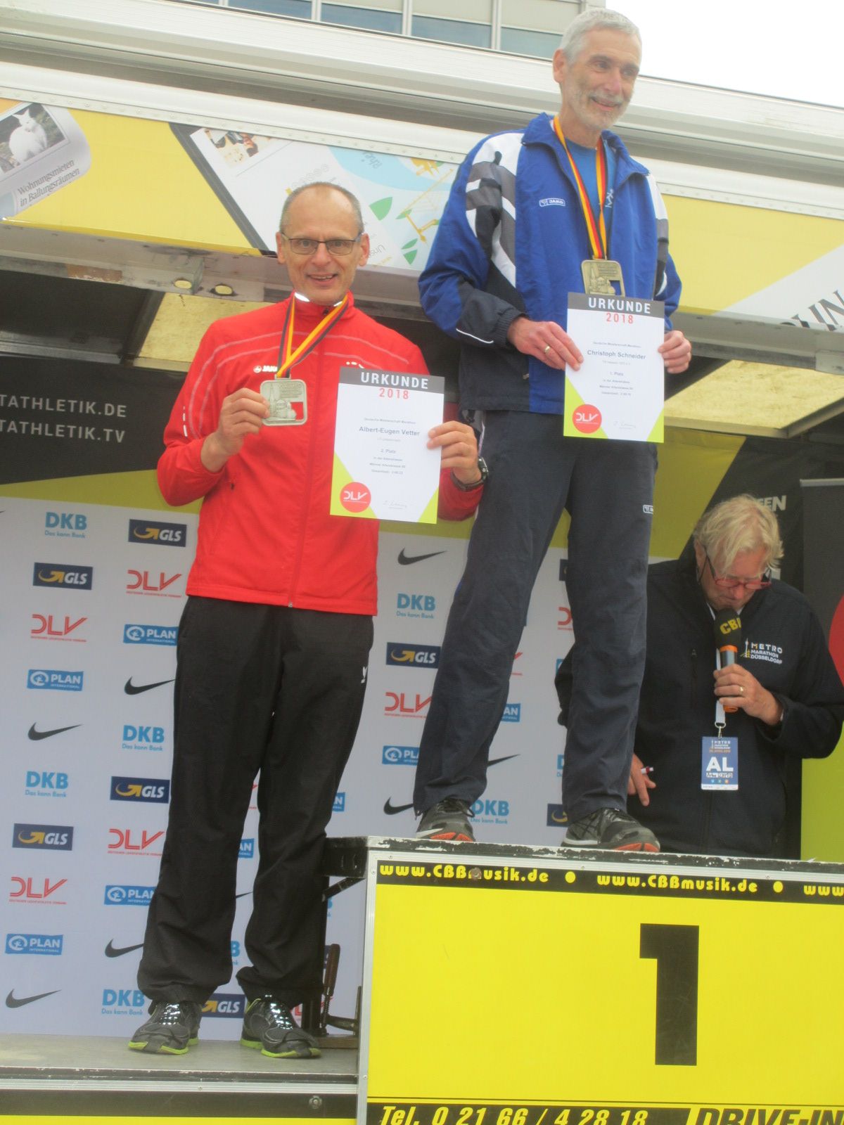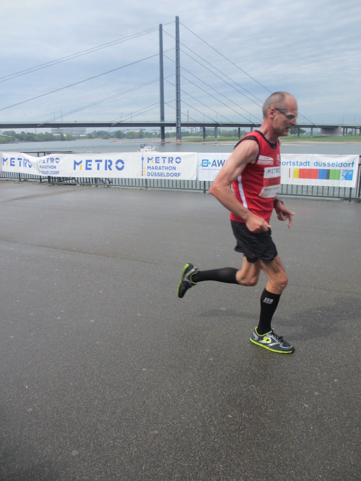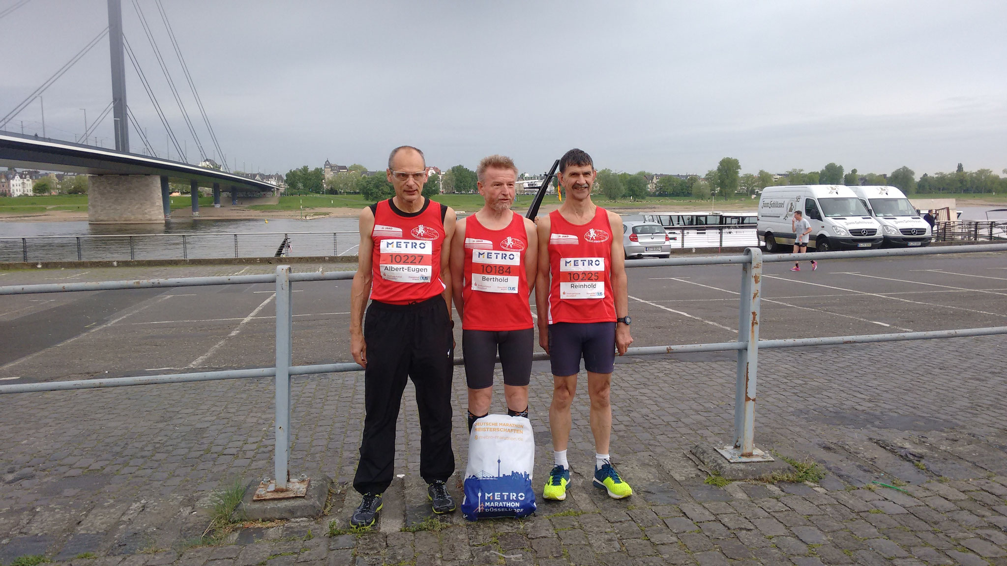 Im Rahmen des 16. METRO Marathons Düsseldorf wurden die Deutschen Meisterschaften im Marathon ausgetragen. Nach der aktuellen Ergebnisliste überquerten 2732 Teilnehmer die Ziellinie. 2167 Männer und 565 Frauen. Davon wurden 252 männliche und 83 weibliche Finisher für die DM gewertet. Darunter waren auch 3 Sportler vom LT Unterkirnach. Bei grauem Himmel und etwas Regen, fiel um 9:00 Uhr der Startschuss. Albert-Eugen Vetter hatte sich wieder nach Plan seiner Trainerin vorbereitet und wurde zusätzlich von der Sportpresse zu den Favoriten der Altersklasse M60 gezählt. Hoch motiviert und auf die Sekunde TOP FIT ging er ins Rennen. Vom Start weg volles Tempo, nur die Phase bei strömenden Regen brachte ihn etwas aus dem Rhythmus, lief er in 3:00:22 h ins Ziel und wurde 2. in der Altersklasse M60 und 119. im Gesamteinlauf der Männer-DM. Etwas weniger Regen und Albert-Eugen hätte nicht nur die SILBEREMEDAILLE erobert sondern auch noch die magische 3h Grenze geknackt! Wir sagen. “HERZLICHEN GLÜCKWUNSCH“ und vielleicht klappt es bei der nächsten DM mit der 3h-Grenze!