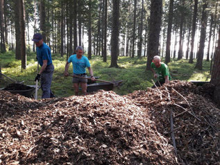 und alte Baumstümpfe zum Vorschein, was natürlich auf Kosten der Sicherheit sowie der Dämpfung ging. Nachdem uns die Gemeinde ca. 40m³ Holzhäcksel auf drei Haufen anlieferte, waren nun spontan 6 LT-ler -darunter eine Dame - bereit, die Verteilung des Materials zu übernehmen. Gut 130 Schubkarren davon wurden im Laufschritt in knapp 3 Stunden auf der 600 m-Strecke verteilt.