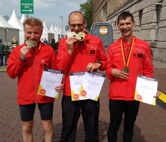 Das M60 Team hatte bereits im Zielbereich ein sehr gutes Gefühl was die Medaillen betraf und bei der Siegerehrung wurden sie auch bestätigt. Zuerst wurde Albert-Eugen mit der SILBEREMEDAILLE geehrt, seine erste Einzelmedaille bei einer DM. Dann das Team mit der GOLDMEDAILLE! Der Fanclub, 3 Frauen stark, war nicht zu überhören. Für Albert-Eugen und Berthold war es nicht nur der Sieg sondern auch die erfolgreiche Titelverteidigung. Für Reinhold, und das zu recht, ist es die erste GOLDMEDAILLE bei einer DM.
