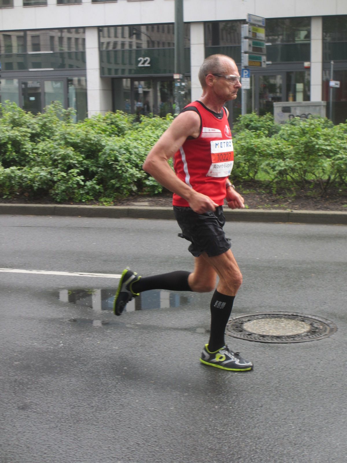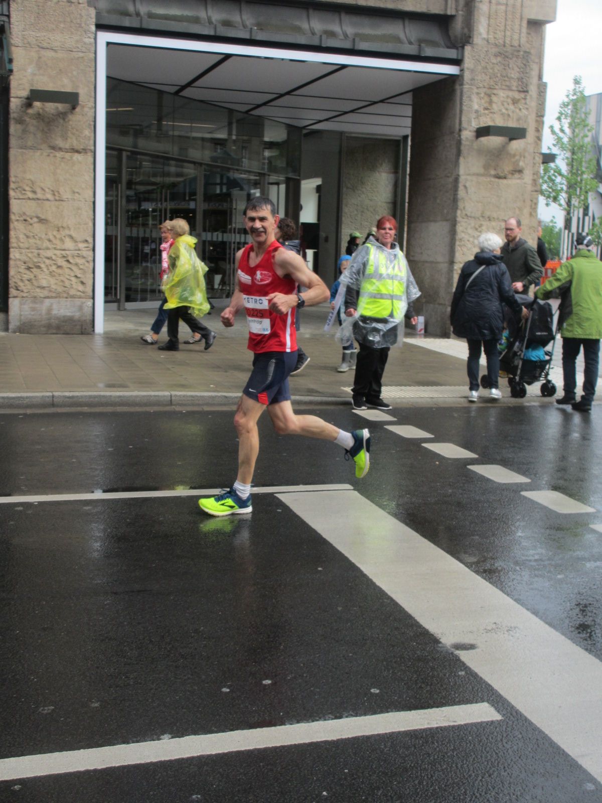 Berthold Seelinger störte sich nicht am Wetter, orientierte sich wieder an der 5 Minuten-Marke pro km, wollte seine Vorjahreszeit wiederholen, lief sehr gleichmäßig in 3:28:43 h ins Ziel und wurde 7. in der Altersklasse M60 und 191. im Gesamteinlauf der Männer-DM.