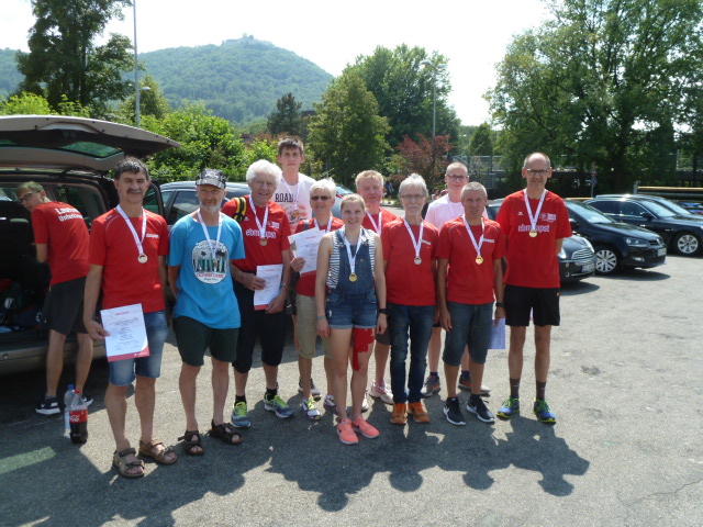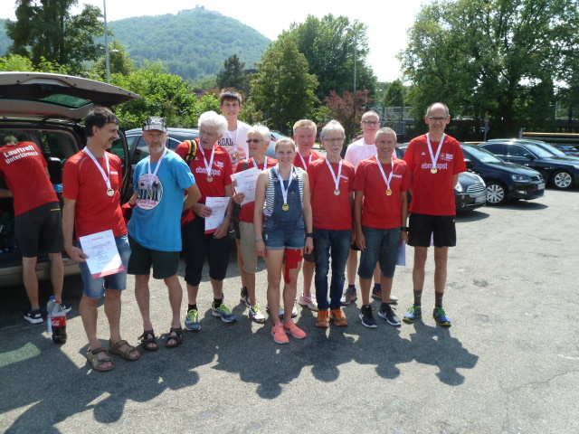 Früh morgens um 6.30 Uhr fuhren 15 hochmotivierte Läufer zu den diesjährigen Baden-Württembergischen Berglauf-Meisterschaften am Hohenneuffen nach Beuren. Der Start war etwa 2 km von Beuren entfernt und wir dachten, super gut zum Einlaufen, doch einige von uns machten daraus versehendlich eine etwas längere Einheit von ca. 4 km. Da es aber trotz des frühen Starts schon gut warm war, kamen alle schon beim Einlaufen zum Schwitzen. Der Lauf zum Hohenneuffen war sehr abwechslungsreich, immer wieder kamen Flachpassagen, danach dann steilere Abschnitte, vor allem am Schluss.